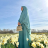 Bij de abaya met strik hoort een bijpassende heup khimaar bij, die tot aan de heupen rijkt. Een prachtige combinatie om zo al je vrouwelijke vormen te bedekken.